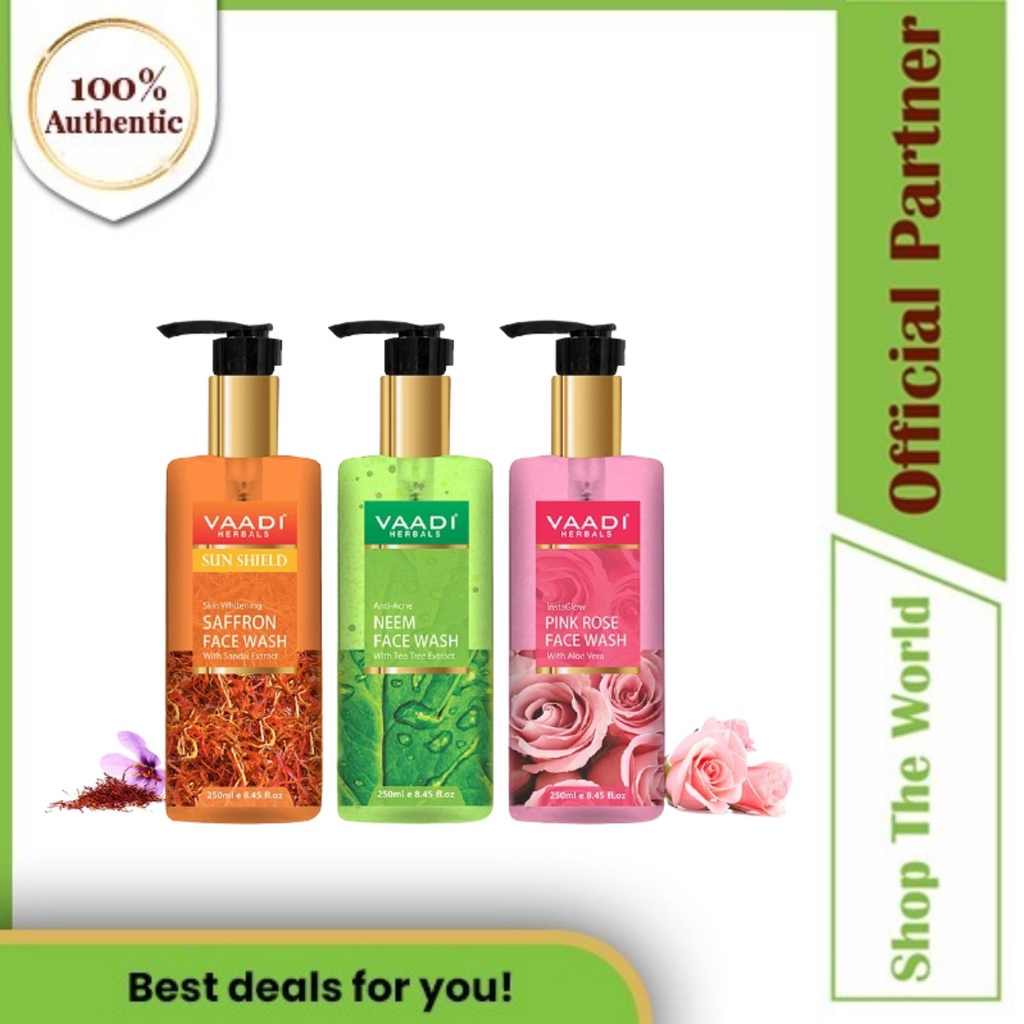 Vaadi Herbals Organic Luxurious Face Wash Trio Pack 3 x 250 ml (Saffron Vaadi Herbal Face Wash this assorted pack of face wash by vaadi herbals contains 4 facewash of 60ml each. specially developed to fight dry and flaky skin condition, this face wash deeply nourishes and moisturizes the skin. clear your skin off impurities and dirt with a face wash or facial bar and gently exfoliate using a scrub to remove dead cells.. Vaadi Herbal Face Wash.